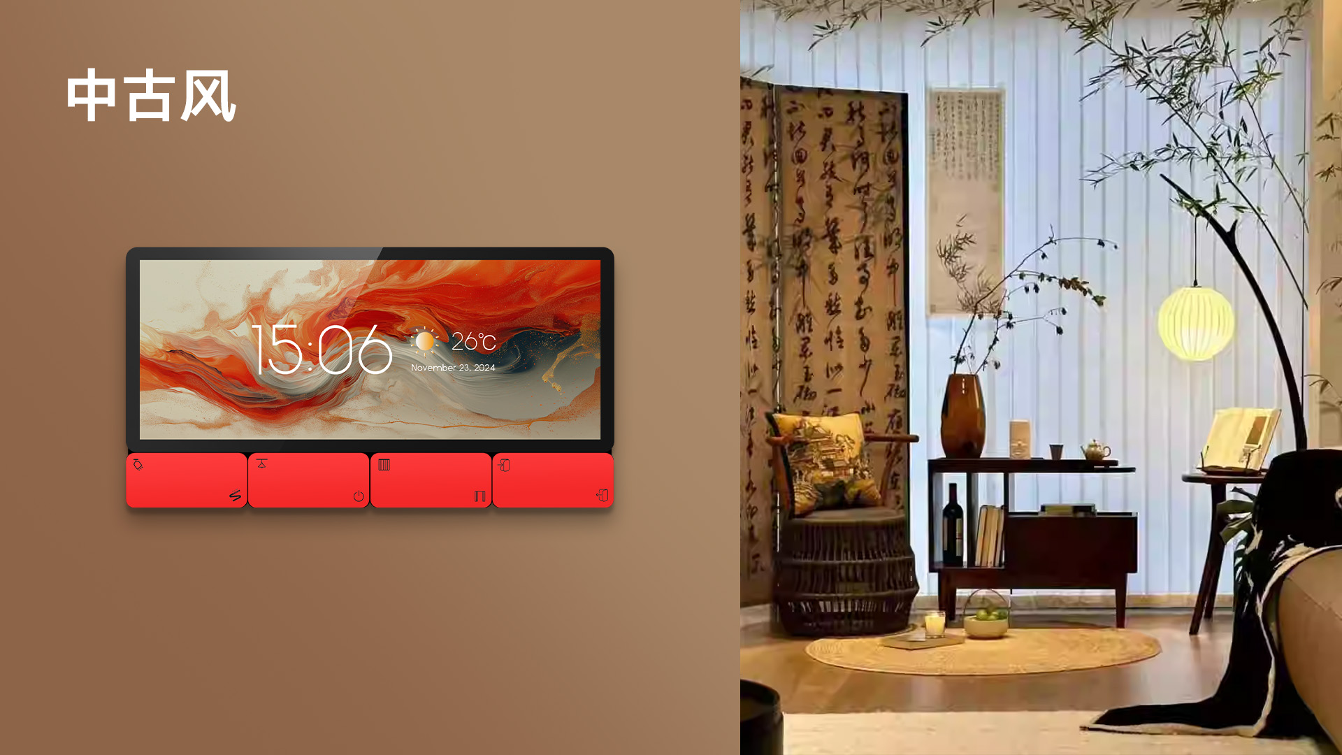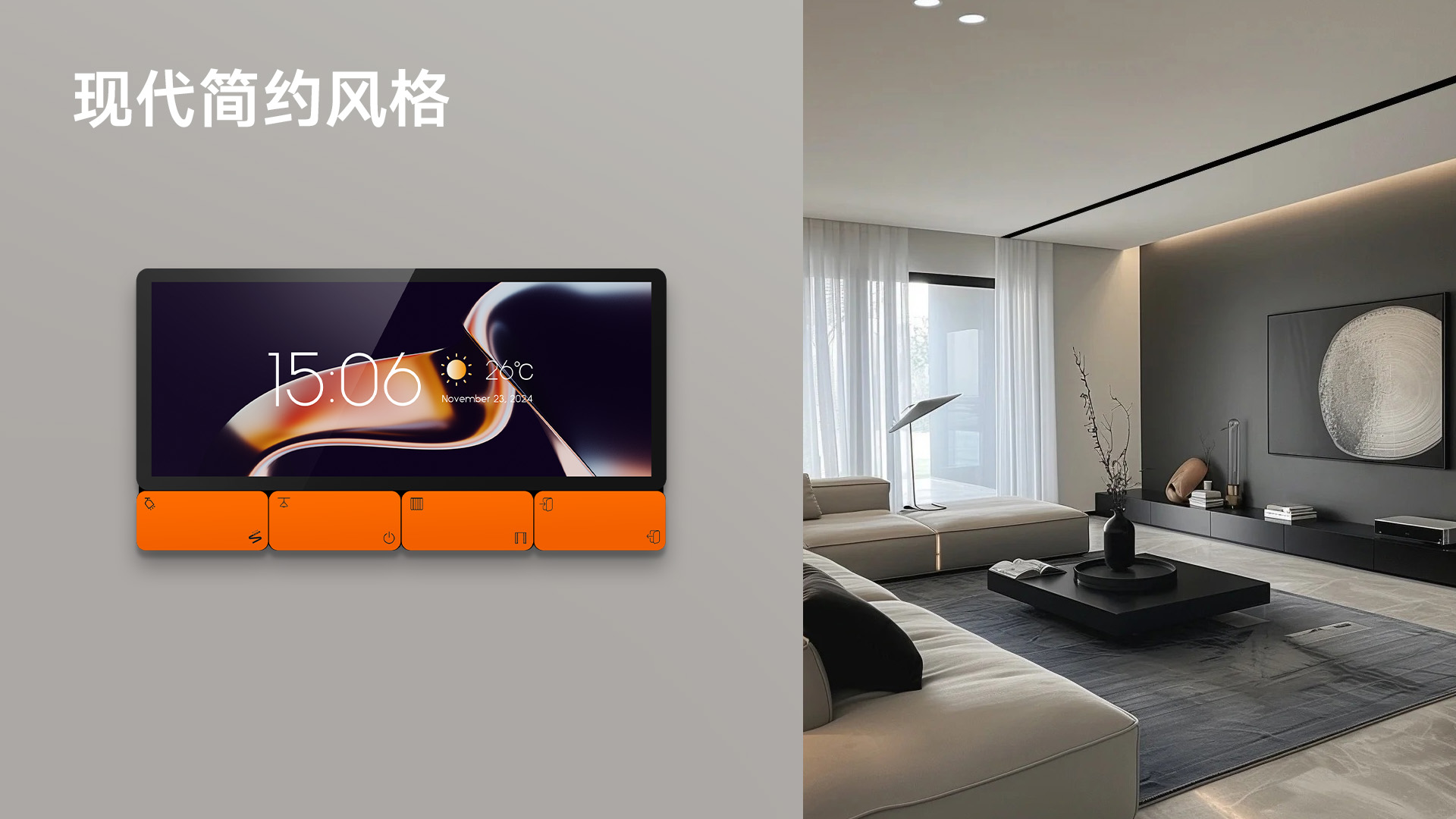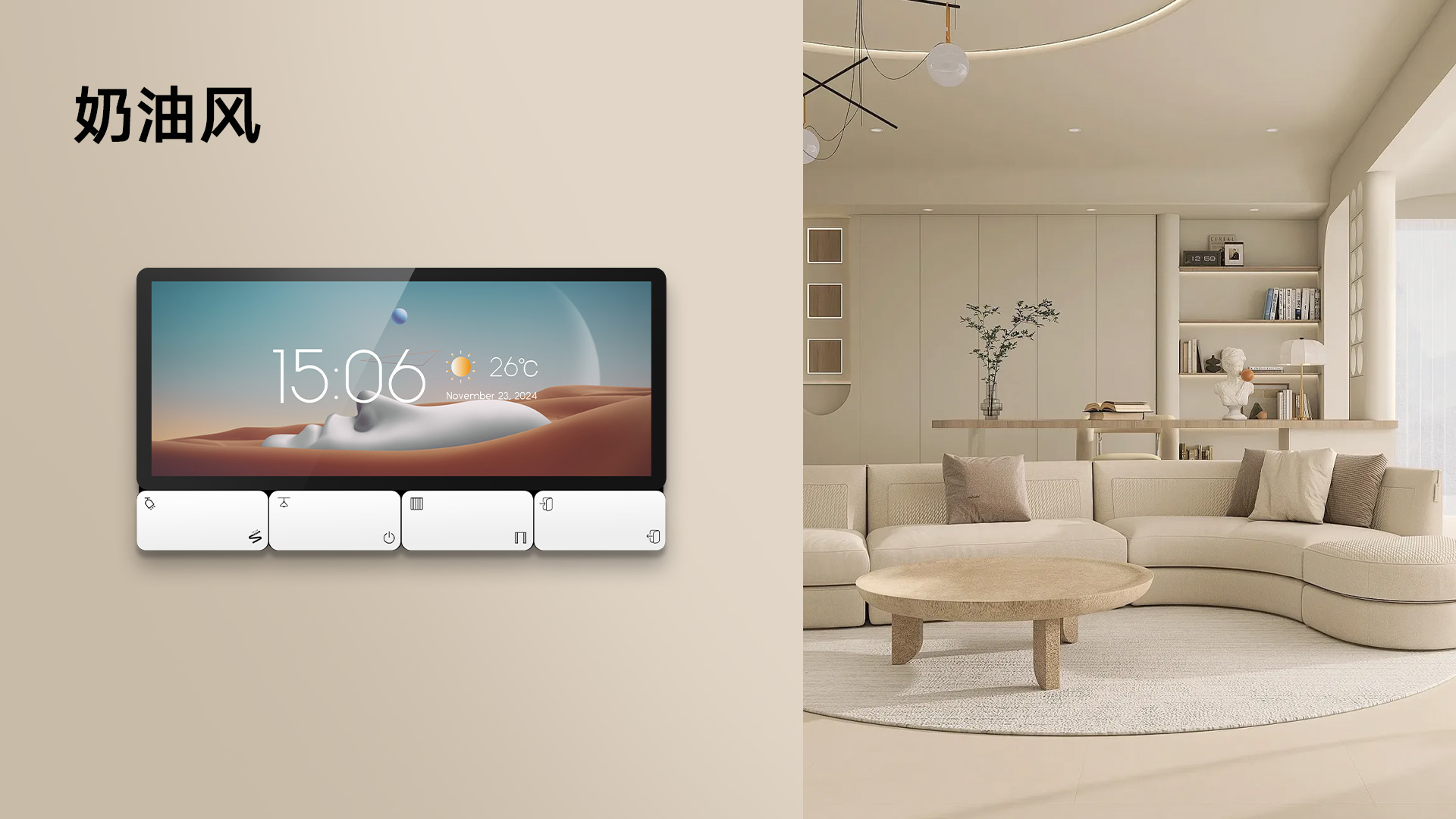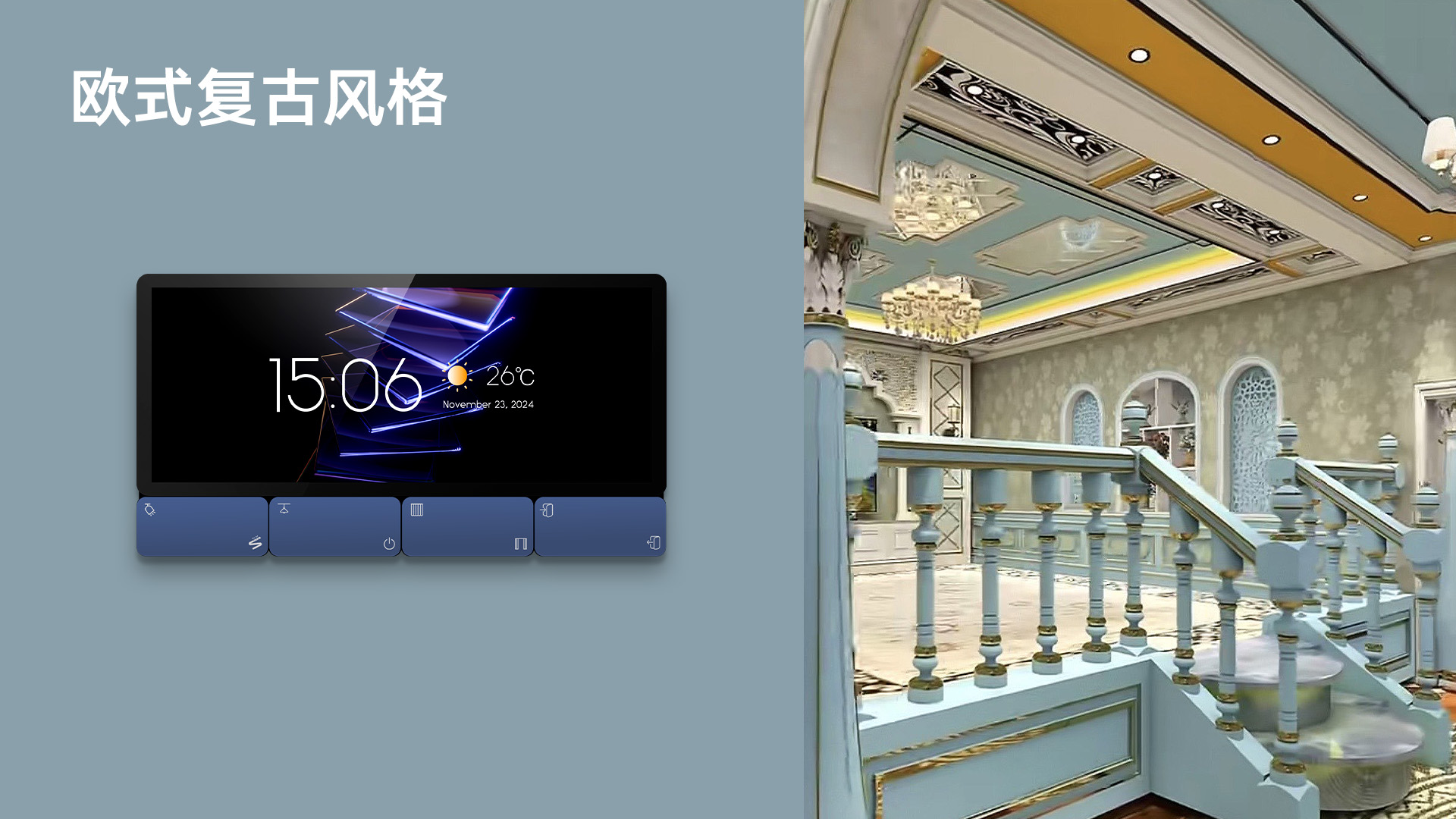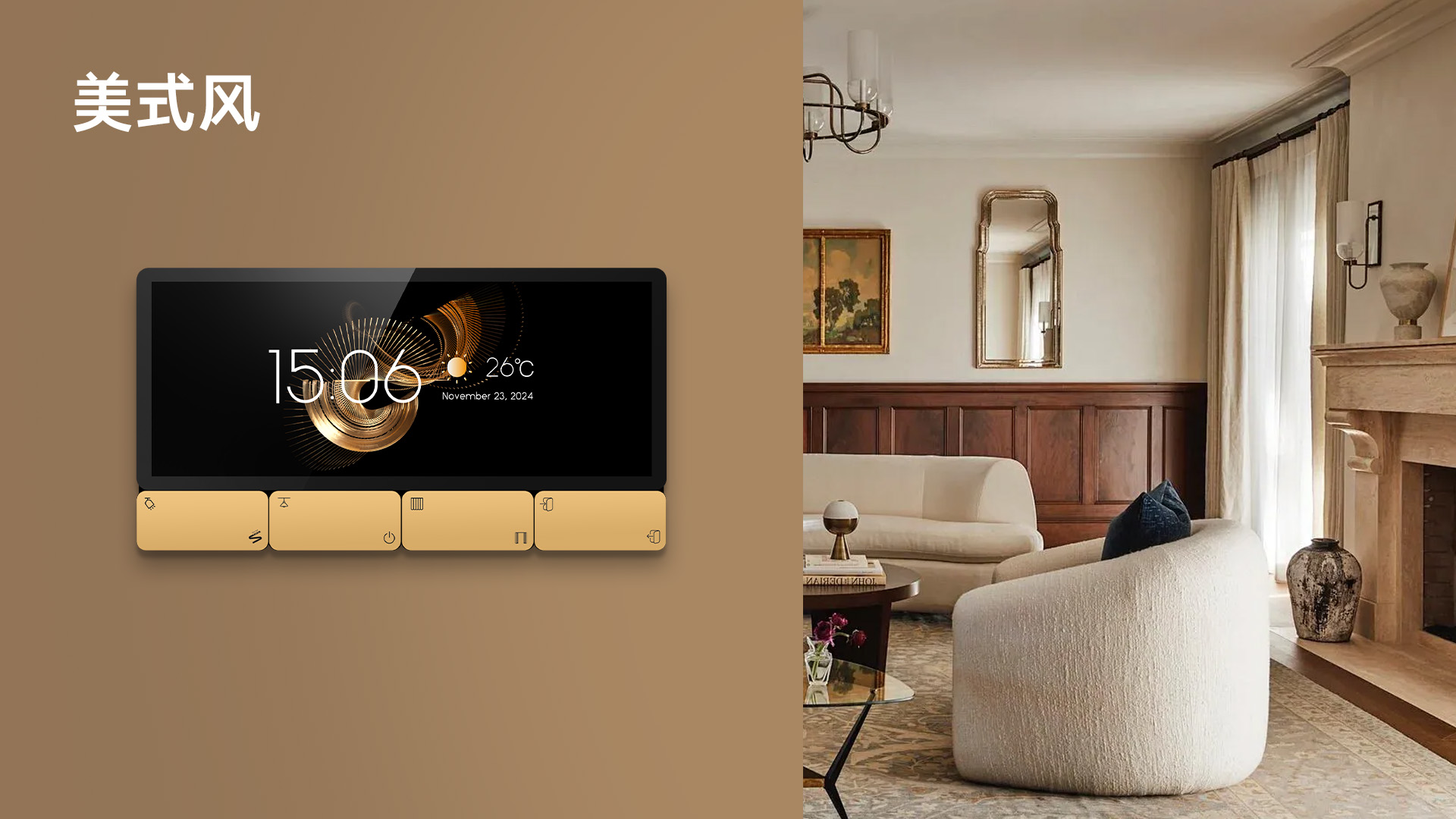 7 款精心設(shè)計的首屏壁紙,覆蓋多元家裝風(fēng)格需求。無論是歐式古風(fēng)的典雅華麗、現(xiàn)代簡約的利落大氣,還是中古風(fēng)的復(fù)古韻味、美式風(fēng)的自由隨性,亦或是工業(yè)風(fēng)的硬朗質(zhì)感、北歐風(fēng)的清新自然、奶油風(fēng)的溫馨柔和,都能精準匹配。通過簡單一鍵切換,智能面板即可與家居環(huán)境完美融合,輕松打造協(xié)調(diào)統(tǒng)一的空間氛圍。