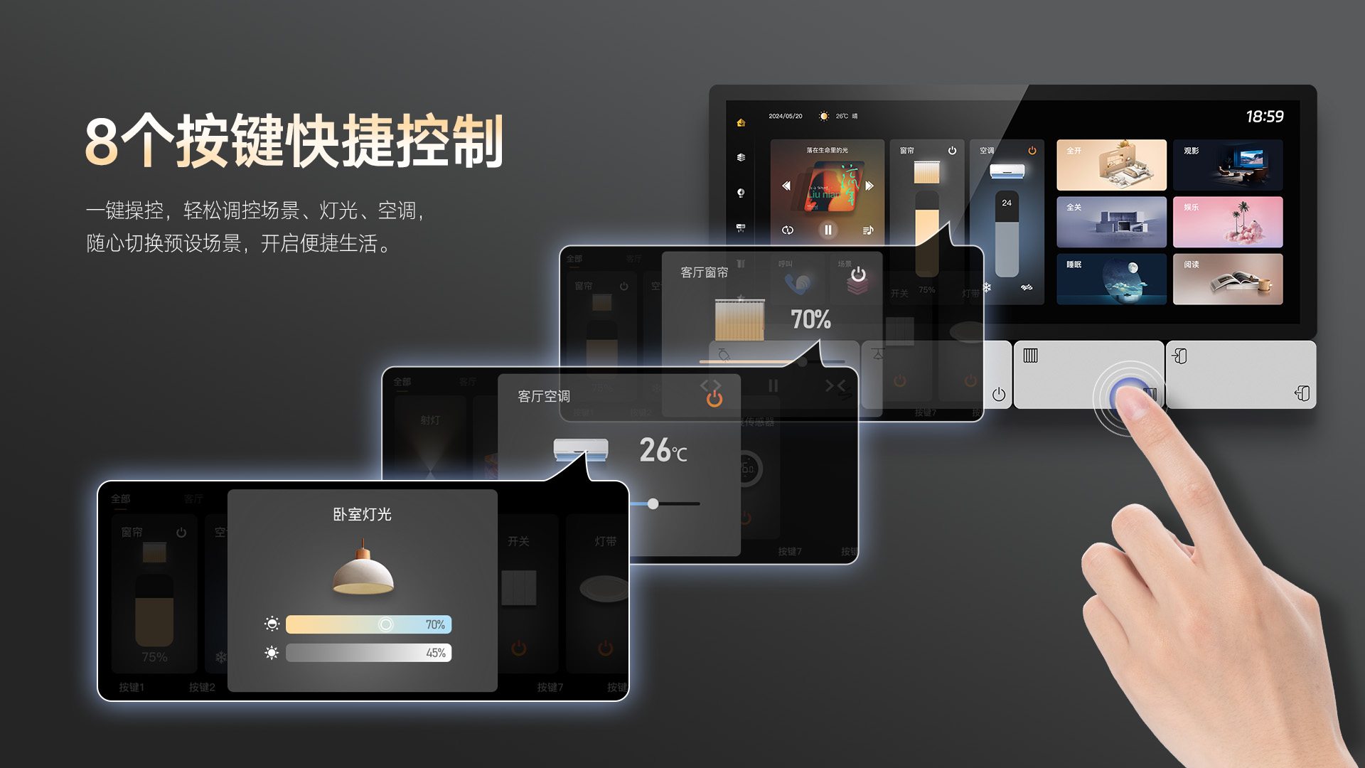 突破常規(guī)設(shè)計,F(xiàn)5 多功能面板重新定義按鍵交互! 4 組 8 個自定義按鍵與大屏深度融合,無需鐳雕工藝,配合全新 UI 交互設(shè)計,彈出式模塊操作便捷流暢,可以是開關(guān)控制、場景切換,或者音量調(diào)節(jié),都能一鍵輕松搞定,此外,當人體靠近時,屏幕會自動亮起,并智能彈出對應(yīng)按鍵預(yù)設(shè)功能,操作無需手動喚醒,一步直達,交互體驗流暢又高效。按鍵背光采用白色冷光和暖黃夜燈切換,夜間使用不刺眼,兼顧實用與氛圍感。7 種按鍵顏色可供選擇,可根據(jù)家居風(fēng)格自由搭配,彰顯獨特個性。