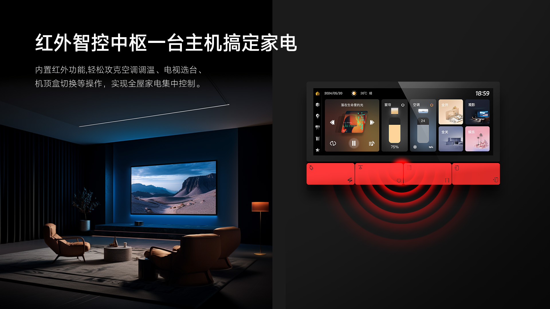 搭載遙控大師功能,基于紅外學(xué)習(xí)技術(shù)輕松 “復(fù)刻” 傳統(tǒng)家電遙控指令,無論是電視、空調(diào),還是風(fēng)扇等常見家電,都能實現(xiàn)精準控制。無需再為繁多的遙控器煩惱,一個面板即可輕松搞定全屋家電,讓家居控制化繁為簡,暢享智能便捷生活。